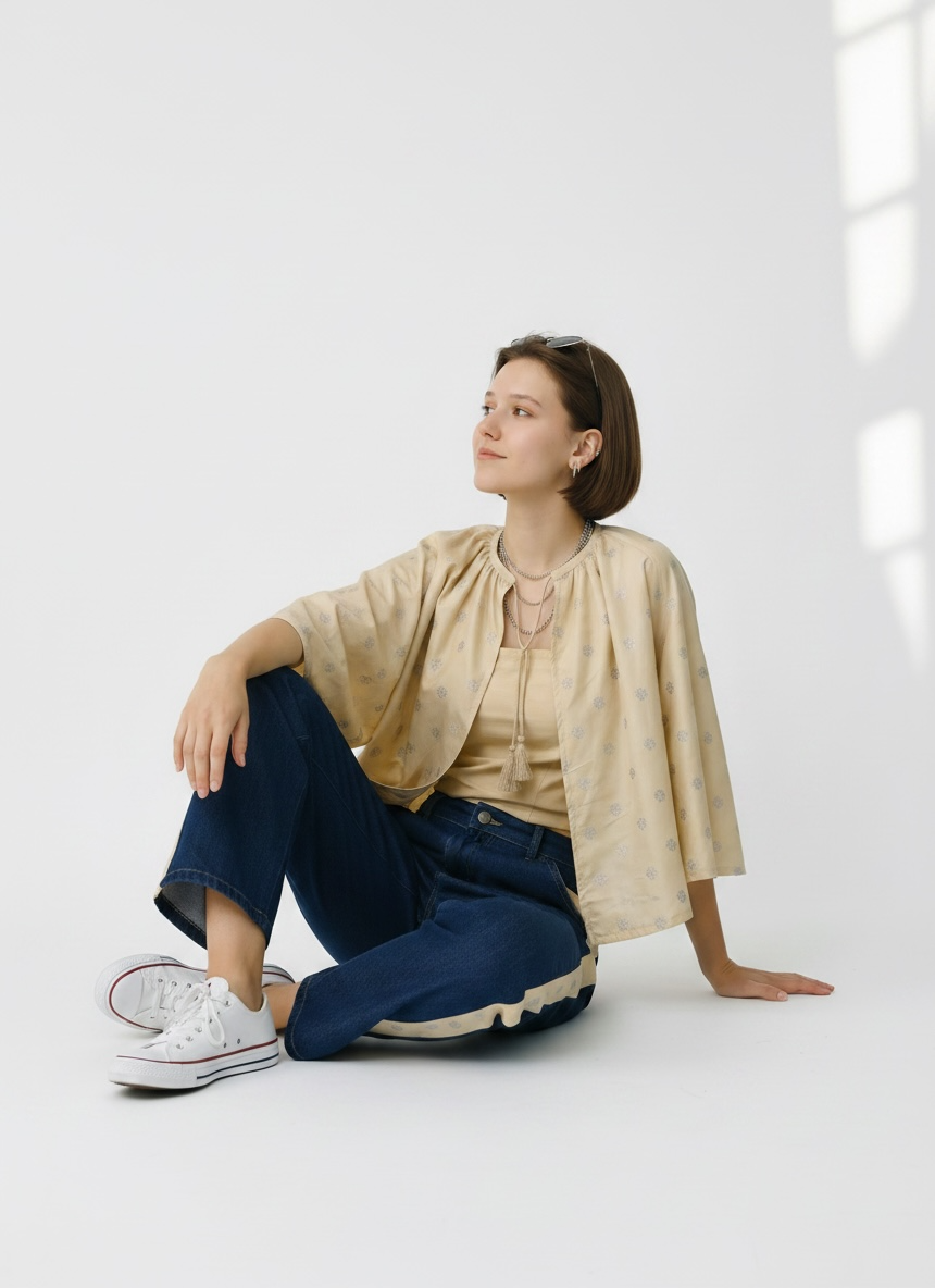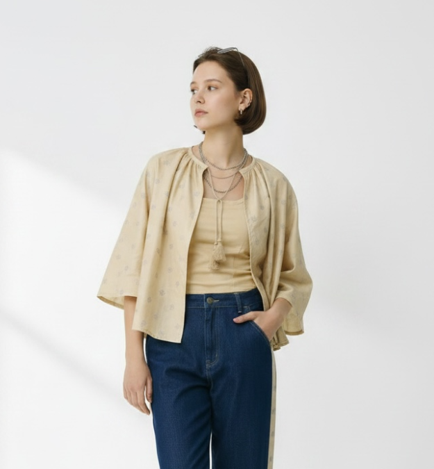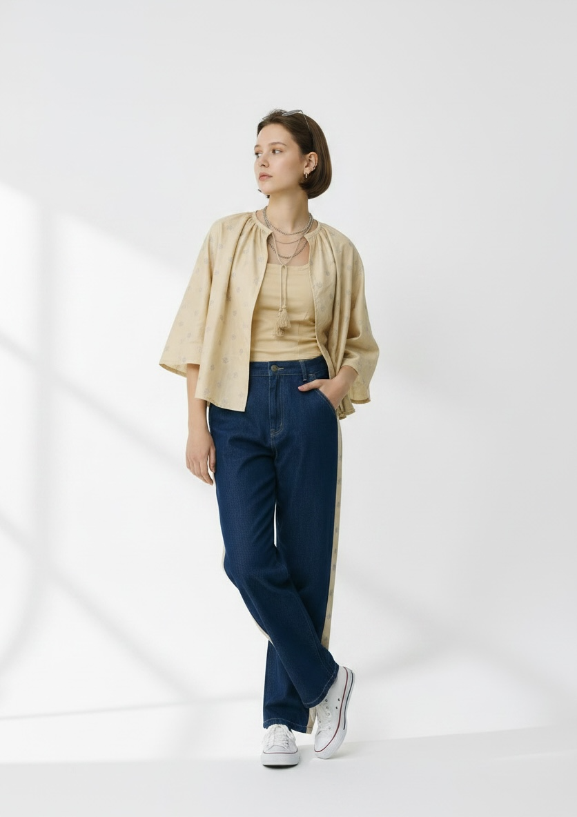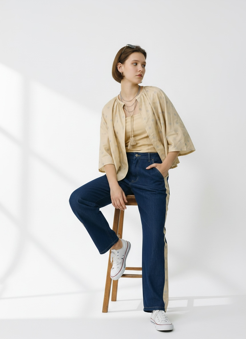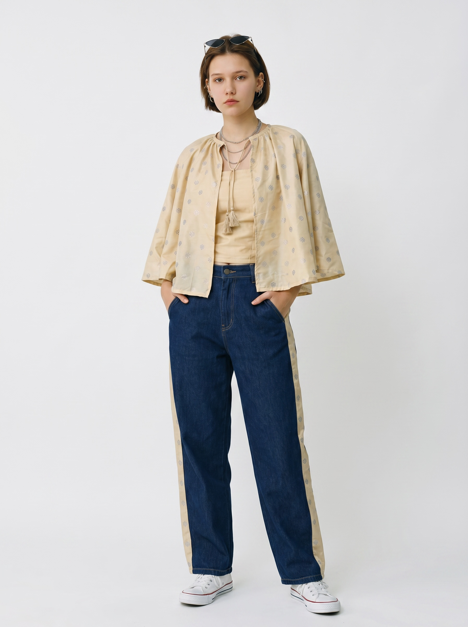 Styled with denim, the look transitions into a modern, wearable form while still retaining its cultural grounding.